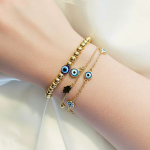 Welcome blessings, abundance, and protection with the Golden Hera Evil Eye bracelet set. This bracelet is handcrafted to draw in protection and good fortune for its wearer.
