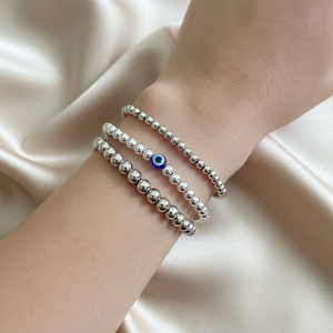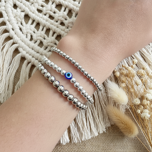 Welcome blessings, abundance, and protection with the Silver Iris Evil Eye bracelet set. This stunning set is handcrafted to draw in protection and good fortune for its wearer.