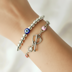 Welcome blessings, abundance, and protection with the Silver Athena Evil Eye bracelet set. This gorgeous set is handcrafted to draw in protection and good fortune for its wearer.