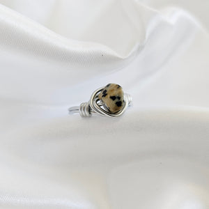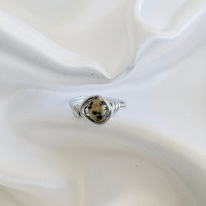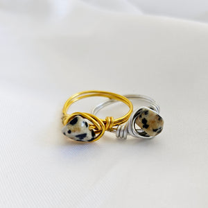 Your Dalmatian Jasper ispresented on a Silver or 18K gold-plated handmade wire wrapped ring band. It's perfect for fans of the minimalist aesthetic or as a stackable ring.