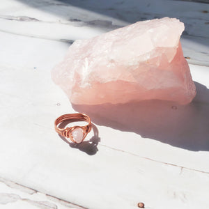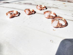 Your Rose Quartz crystal is presented on handmade 20g wire-wrapped copper ring band. It's perfect for fans of the minimalist aesthetic or as a stackable ring.