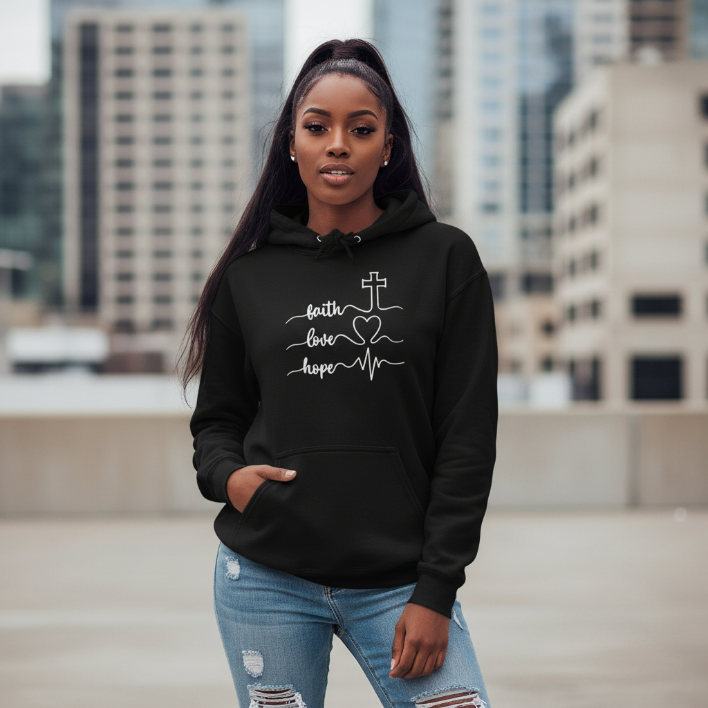 The Faith • Love • Hope Hoodie was created for the woman who carries her light wherever she goes. Whether you’re journaling by candlelight, running errands, or spending quiet mornings in prayer, this cozy layer wraps you in the peace of divine energy.