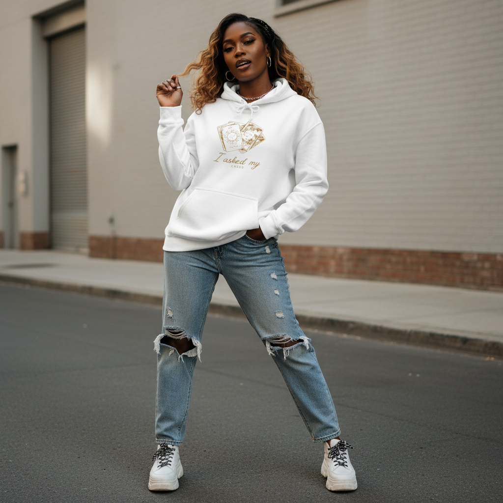 Crafted from a soft, cozy cotton blend, this hoodie is designed for everyday wear. The classic unisex fit, plush interior, and roomy kangaroo pocket make it perfect for layering up during moon rituals, card pulls, or casual days when your energy speaks for itself.