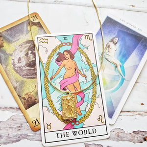 Your World Tarot Pendant is presented on a stunning, 20-inch, 14k gold-plated box chain necklace. It's perfect for fans of the minimalist aesthetic or as a layering piece.