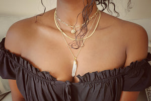 This necklace is an adjustable 16-18-inch, 14K gold filled chain mixed with stainless steel.