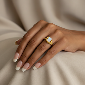 Your Moonstone is presented on a Silver or 18K gold-plated handmade wire wrapped ring band. It's perfect for fans of the minimalist aesthetic or as a stackable ring.