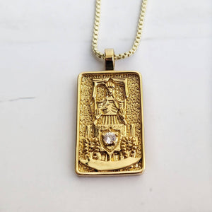 Keep the energy of success, ambition, and forward movement with you at all times with the Chariot Tarot Card necklace.