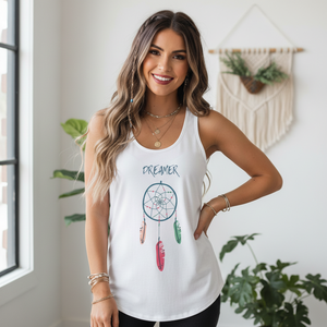 Unleash your inner dreamer with our Dream Catcher Tank Top. This racerback tank serves as a reminder to never stop dreaming and chasing after your aspirations. Perfect for the spiritual and inspirational fashion lover. (Dream big with this dreamer tank top!)