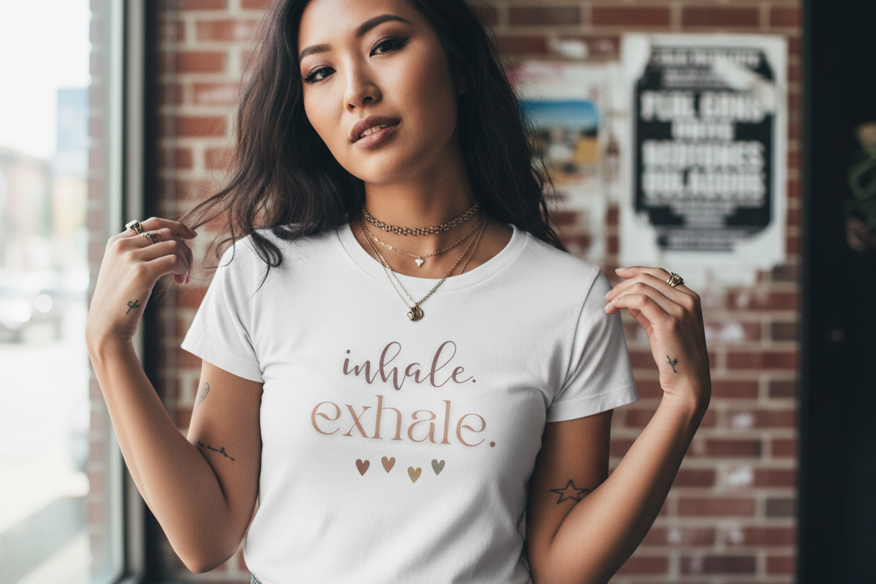 The Inhale. Exhale. Women’s Motivational Tee is a gentle reminder to slow down and return to yourself. Designed to ground you in the present moment, this piece invites calm, clarity, and ease into your everyday rhythm. Whether you’re navigating a busy day or savoring a quiet moment, this tee keeps you centered with every breath.