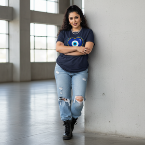 Perfect for lovers of coastal blues, spiritual charm, and protective energy, this tee pairs beautifully with denim, layers, and your favorite accessories.